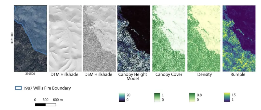 Digital Surface Model: A digital surface model (DSM) is a grid of elevations representing the top of the landscape and is typically produced from the first lidar returns. In this area, the DSM shows a distinct contrast in vegetation cover that closely follows the Willis fire boundary: There is dense vegetation outside of the burn area, while the burned area shows a more open canopy with scattered trees.