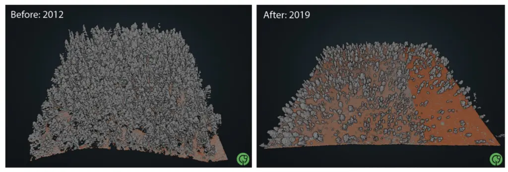Multi-temporal lidar refers to two or more lidar datasets collected over the same area at different points in time. Comparing these datasets allows scientists to measure how forests and the bare-earth terrain change in response to wildfires and other natural hazards. Such analyses reveal trees lost to fire, quantify reductions in canopy cover, and detect debris flows that can threaten critical infrastructure.