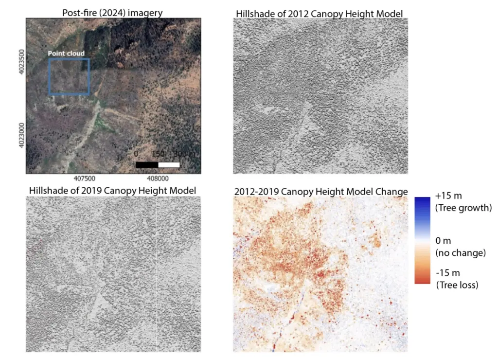 Lidar-derived change maps from the 2018 Cat Fire: (Top-left): Satellite imagery from Google Earth. Hillshade of the canopy height model from 2012 (top-right) and 2019 (bottom-left), showing vegetation structure over a flattened ground surface. (Bottom-right) Canopy height model change between the 2012 and 2019. Red areas indicate complete tree loss or reductions in tree height, and white indicates no change. Small patches of blue represent increases in tree height, which may reflect long-term growth or seasonal differences between surveys.